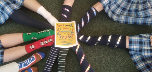 ダウン症への意識向上とインクルージョン(包摂)の重要性を伝えるため、生徒をはじめ教職員もカラフルな靴下を披露しました。